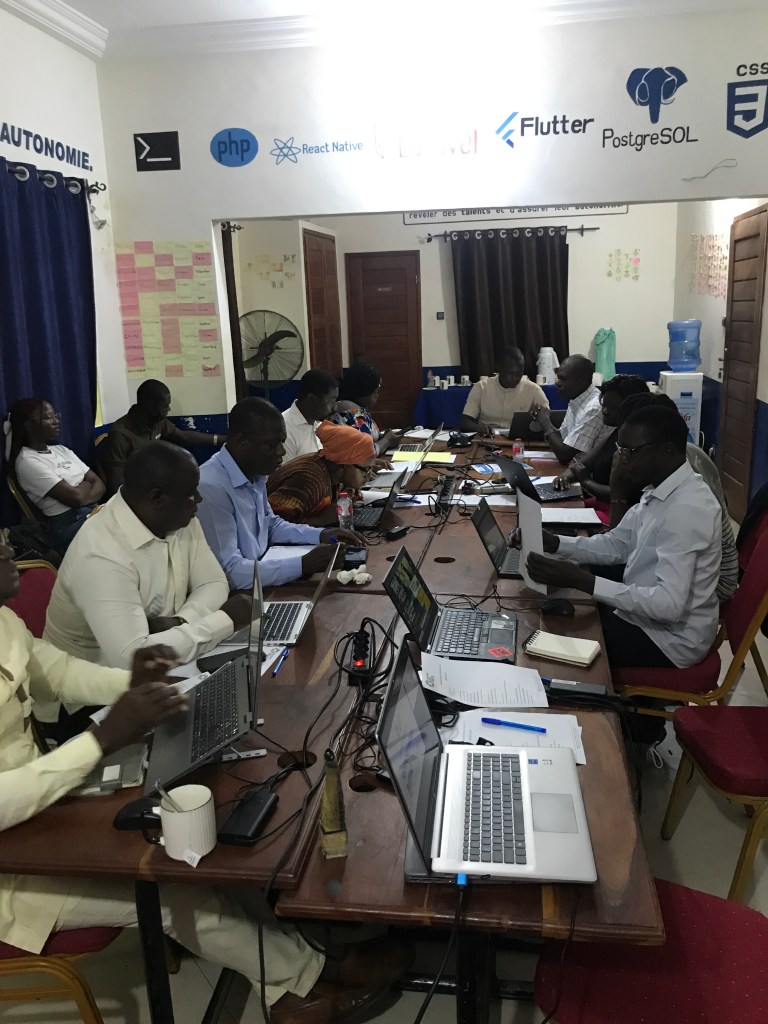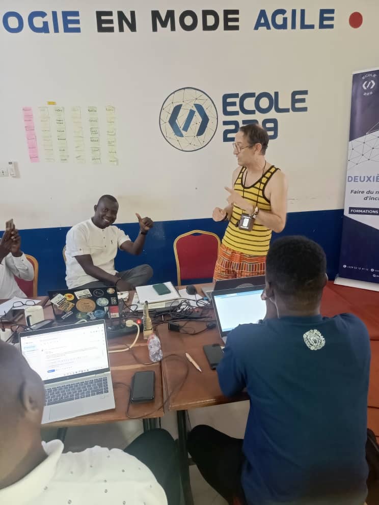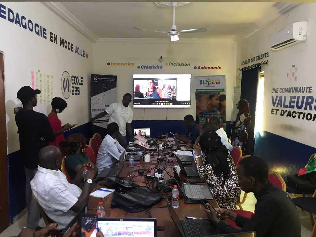 Erwan Vappreau et Catherine Villeret, co-présidents de Tiers-Lieux Edu, se sont ensuite connectés en visio-conférence et avec Nonhouegnon Raoul Letchede et de Marie-Auxiliatrice Da Silveira (de la merveilleuse équipe du Blobus), ont procédé à la création et la validation des comptes des fablabs du sud sur la plateforme. Cette journée étant celle des fabmanagers, nous avons pu également disposer de 30 minutes en début d’après-midi pour leur présenter dans le détail le challenge Imagine Makers et ses modalités de participation.