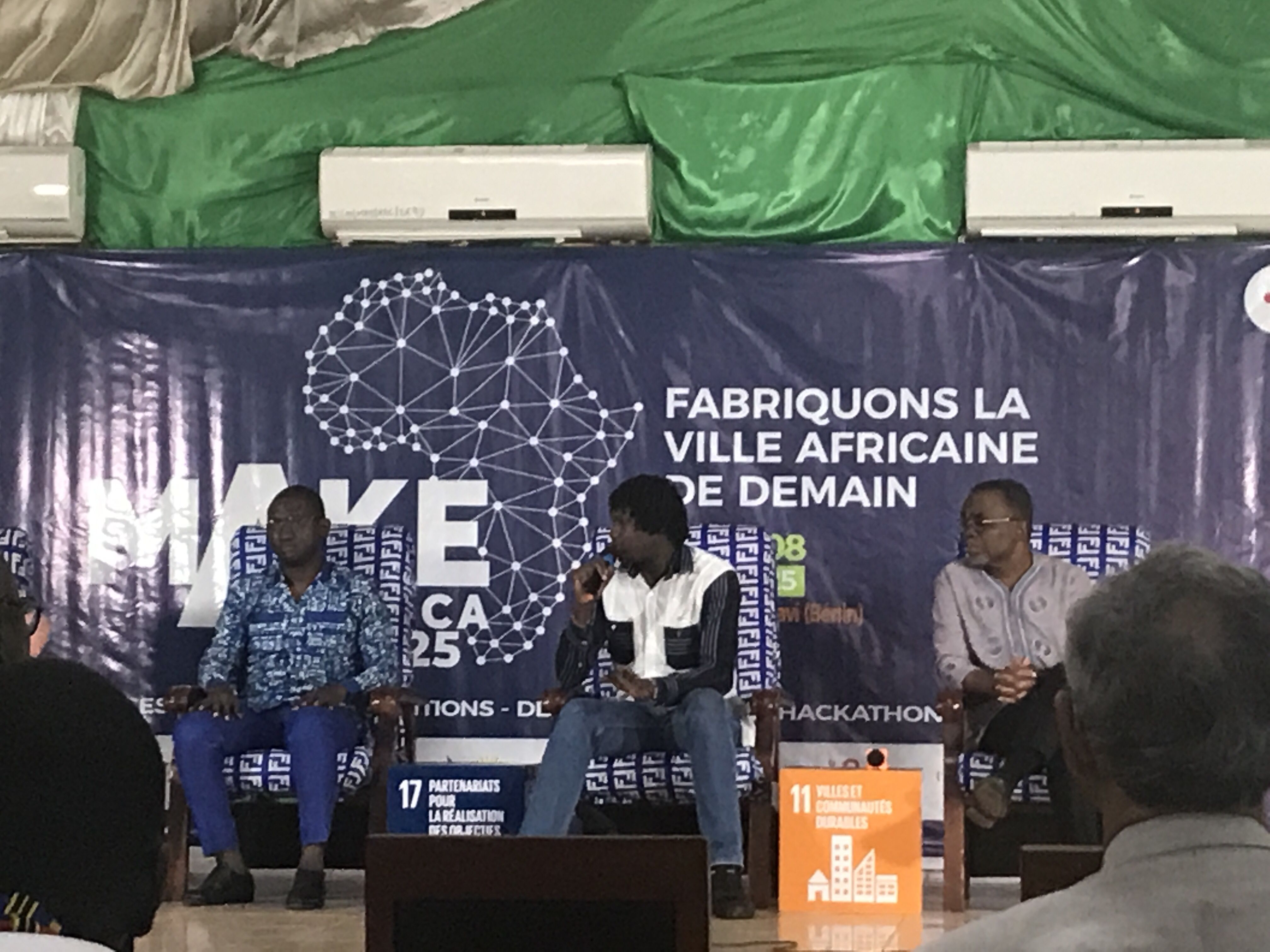 Ce premier jour était fort en émotion car nous avons pu retrouver de très nombreux amis porteurs de projets au sud ! Le lendemain, le 4 novembre, ce fut ouverture officielle de l’événement dans l’amphithéâtre Idriss Deby de l’Université d’Abomey Calavi (UAC). Le programme, ambitieux, se déroulait sur 4 espaces principaux : un espace de pleinières et de tables rondes parfaitement couvert en captation et diffusion vidéo, un espace pour les organisations associées (Wikipédia) et le hackathon « Fabriquer la ville de demain », un espace de stands extérieurs pour les entreprises et projets d’entreprises, et Make Africa TV, un plateau d’enregistrement de haute qualité qui tournait en permanence.