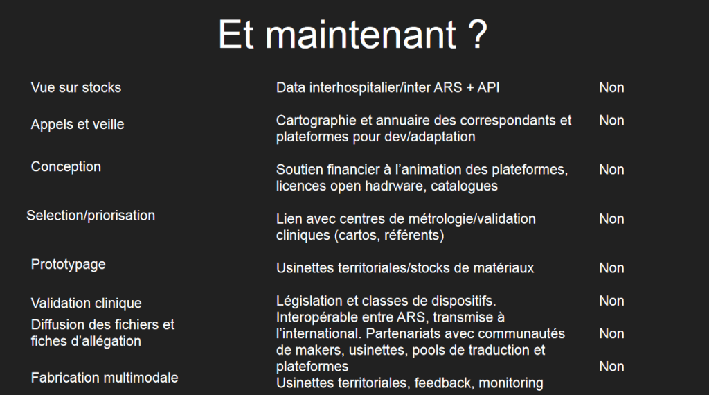 Nous invitons les personnes intéressées par la santé et les réponses invoquant les communs opérants (qui ne restent pas à l’état de data, d’open-science ou de plans sur le net, mais aboutissent à des objets dans les mains de soignants ou des personnes au terrain) à regarder les diapos 6 et 7 du déroulé. L’une décrit un processus de santé ouverte unique en France qui a permis de créer une boucle complète pour faire face à la pénurie d’équipements dans et hors milieu hospitalier.