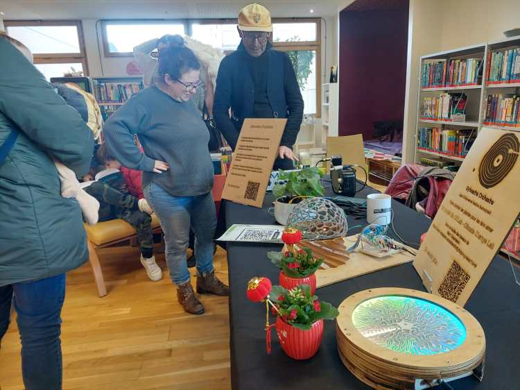 Samedi, le jour J, nous sommes allés à la rencontre du public avec un stand monté cette fois-ci à la médiathèque de Crosne pour faire découvrir comment on peut « faire chanter les plantes pour les faire aimer ». Enfants en bas âge venus avec leurs plantes que nous avons fait chanter, échanges sur le processus technique, mais aussi réactions intéressantes sur le fond, notamment grâce à la présence d’un bénévole lançant sur place une pratique que nous aimons beaucoup : les cafés philos.