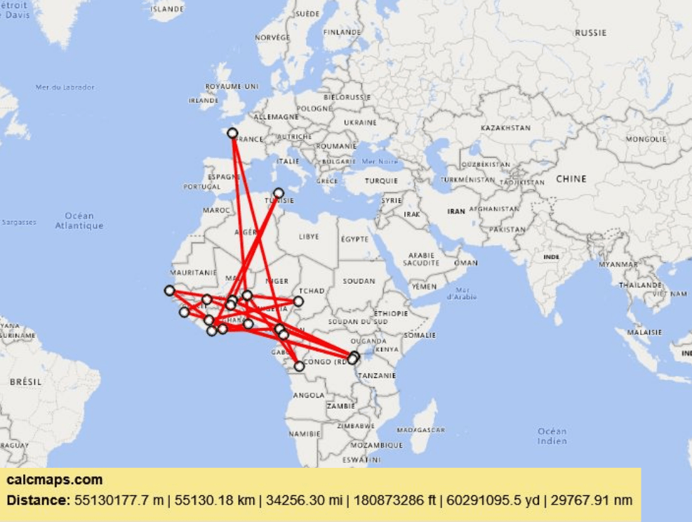 Le premier au Bénin, le dernier au Cameroun, le tout tracé sur calcmaps.com avec le calcul kilométrique (je n’ai pas compté le temps…).