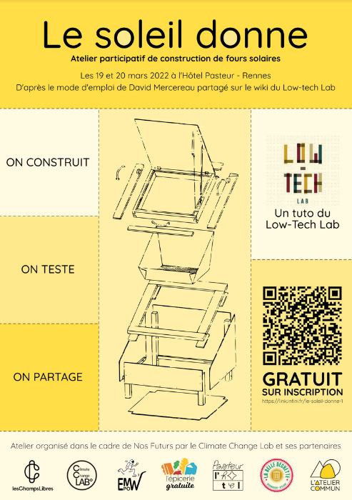 Nous avons le plaisir d’accompagner le nouvel événement organisé par les Champs Libres, Nos Futurs, par un atelier solidaire de construction de fours solaires sans brevet les samedi 19 et dimanche 20 mars 2022 à l’Hôtel Pasteur à Rennes.